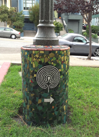 The artist, Blake Sherlock, has lived in San Pedro de Laguna on Lake Atitlan in Guatemala for the past ten years. Sherlock was raised in Boise, went to school at Brown and RISD,  and lived in the Lower Haight for a time in the mid- 1990s.  Sherlock designed and installed the mosaic work around the base and sides of the table labyrinth at the Scott Street Labyrinth, as well as the handicap access and No Skateboarding signs.  He led the mosaic tile workshop at the Tag Sale (and day after) in 2006 where neighbors created the 225 square tiles that now surround the labyrinth. The last ten tiles left over from that event are now on the top of the pillar piece.