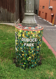 Believe it or not, there used to be no signage on Scott Street identifying the eastern side of the street as part of Duboce Park which includes the Rec Center, Labyrinth, and grassy areas. To remedy that situation and turn a drab concrete pillar into a work of art that directs people to the various parts of the park,  artist Blake Sherlock installed a colorful mosaic piece in early October to surround the concrete pillar that supports the light pole located at the top of the passageway between the Rec Center and Carmelita Street.