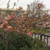 The Ornamental Plum trees (shown at top) along the Scott Street side of the park are now in full bloom with pink and pink-white flowers along Scott Street and many other streets near the park. The flowers disappear rather quickly and will be replaced with purple fruits about one inch wide. The trees will sprout ruby leaves that darken to reddish-purple. They can live for over 50 years.