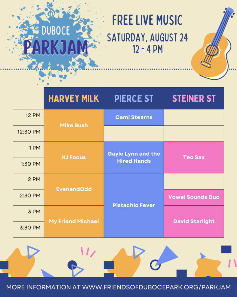 Friends of Duboce Park hosted its third Duboce ParkJam on Saturday, August 23 from 12 to 5 PM! This free event brought live music to Duboce Park with performances from local musicians, songwriters, and groups, including: