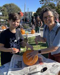 Big success! About 100 people of all ages showed up and carved and decorated pumpkins. There were parents showing the carving process to their kids, many of whom had never carved a pumpkin before, and groups of young adults who worked together to create their pumpkins.