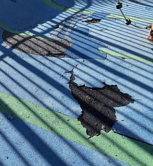 The blue surface of the Youth Play Area is in terrible shape. We have requested repairs and were told that resurfacing is on the Rec & Park repair list, but it is further down the list since there are many sites in much worse condition than ours.