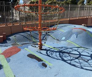 Temporary repairs were made to the rubber surface of the Youth Play Area on March 10, and the area was closed for 24 hours. The new patches are rust or black and do not match the original blue and green in the rest of the YPA because Rec & Park is not have those colors in their inventory. The original surface was installed in 2011. The normal lifespan of this type of surface is about 10 years.